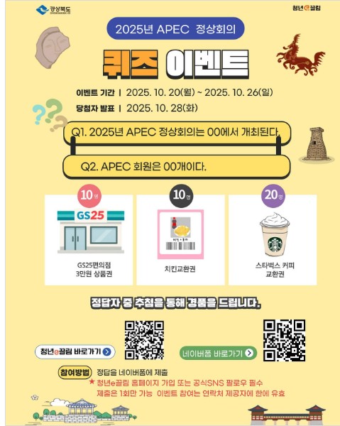 다가오는 2025년 APEC 정상회의를 맞아 청년e끌림에서 준비한 특별한 퀴즈 이벤트에 참여해보세요!
